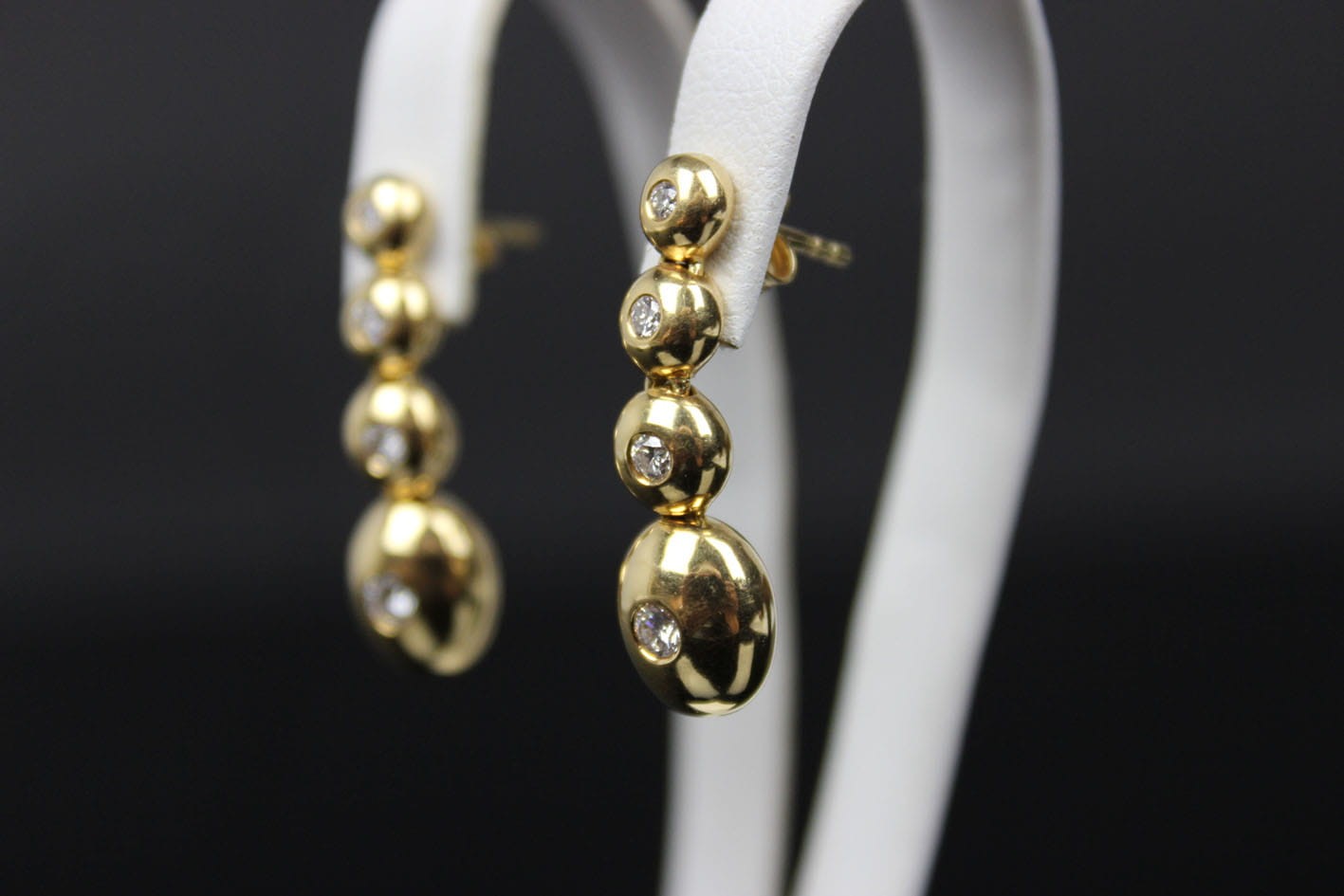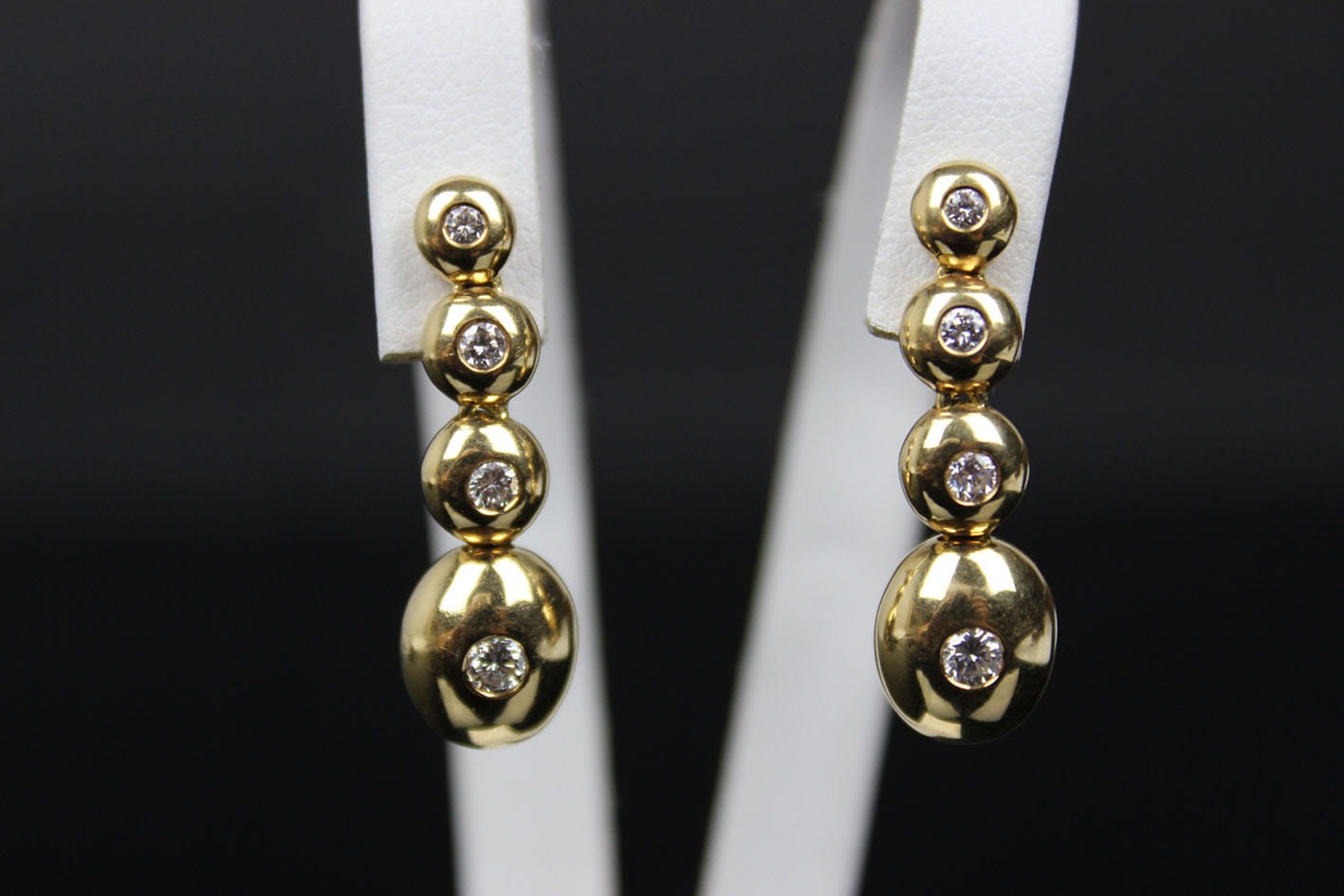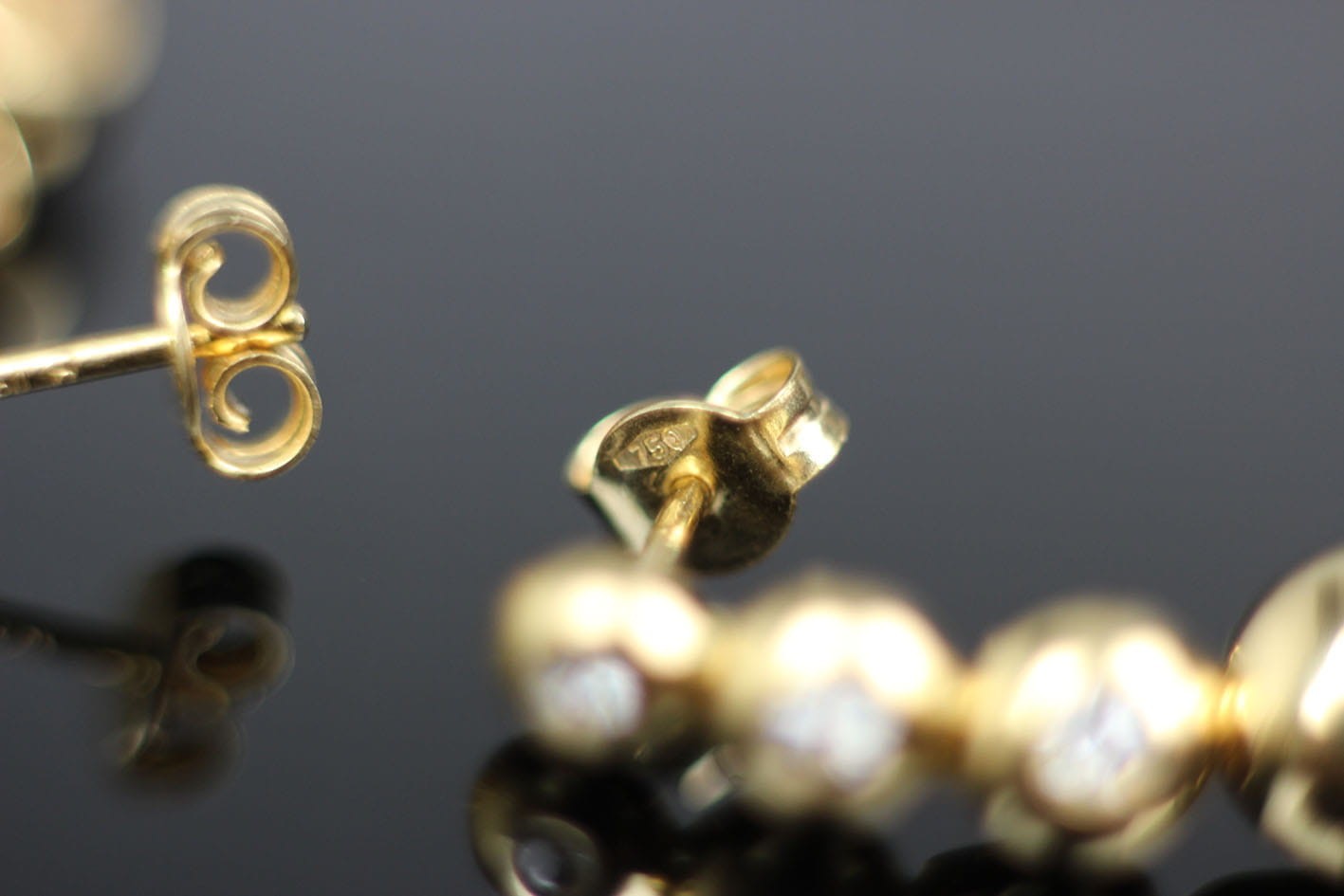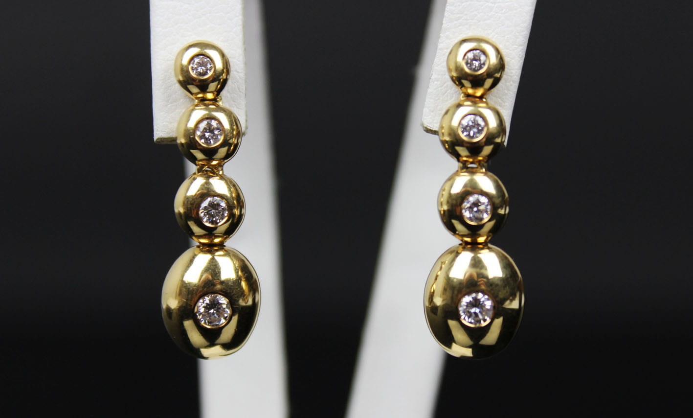 Szykowne kolczyki z lat 70-tych XX wieku, wykonane w 18 karatowym złocie, sygnowane na sztyfcie i barankach puncą 750. Kolczyki kameryzowane ośmioma diamentami w szlifie okrągłym brylantowym. Masa kamieni ok. 0,34 ct, barwa G-F, Czystość VS-SI. Zapięcie typu sztyft. W komplecie certyfikat renomowanego rzeczoznawcy diamentów. Wymiary: