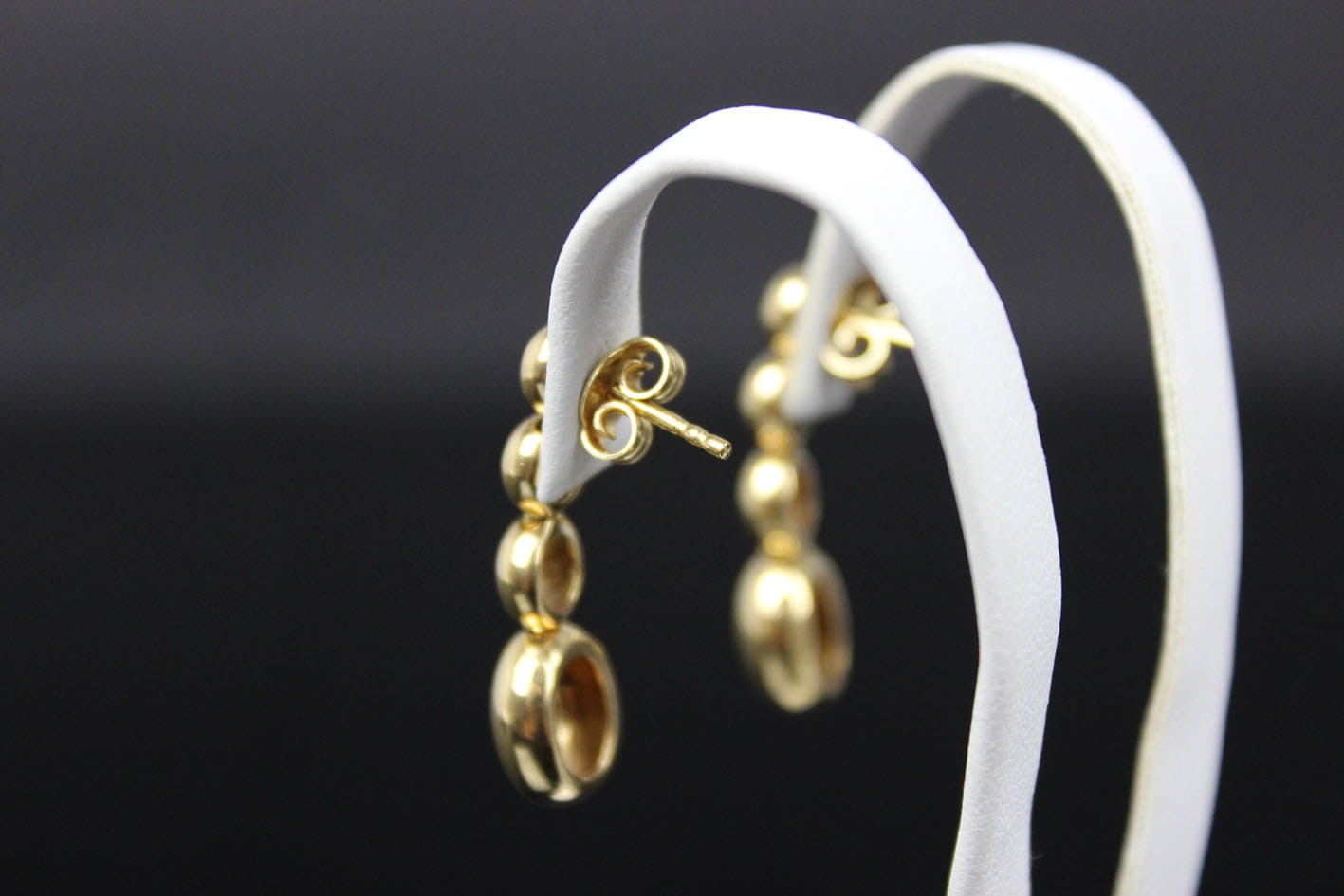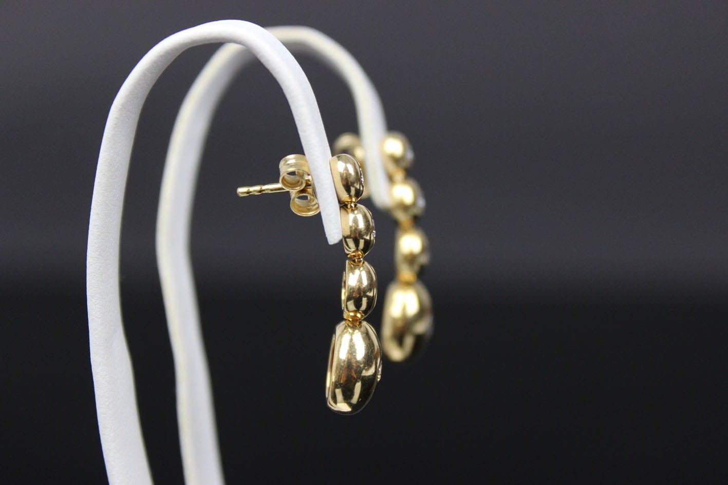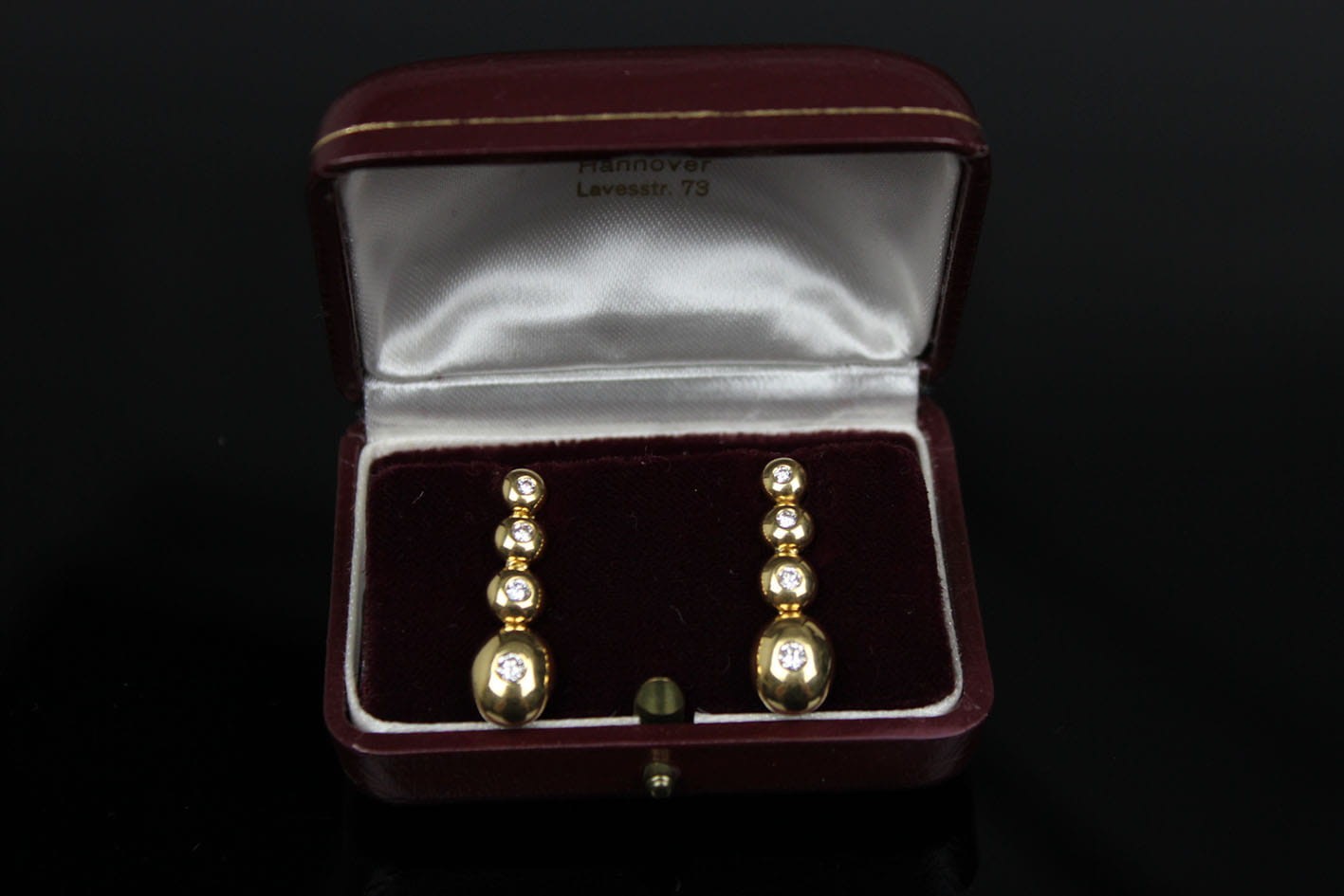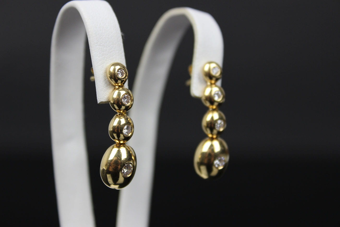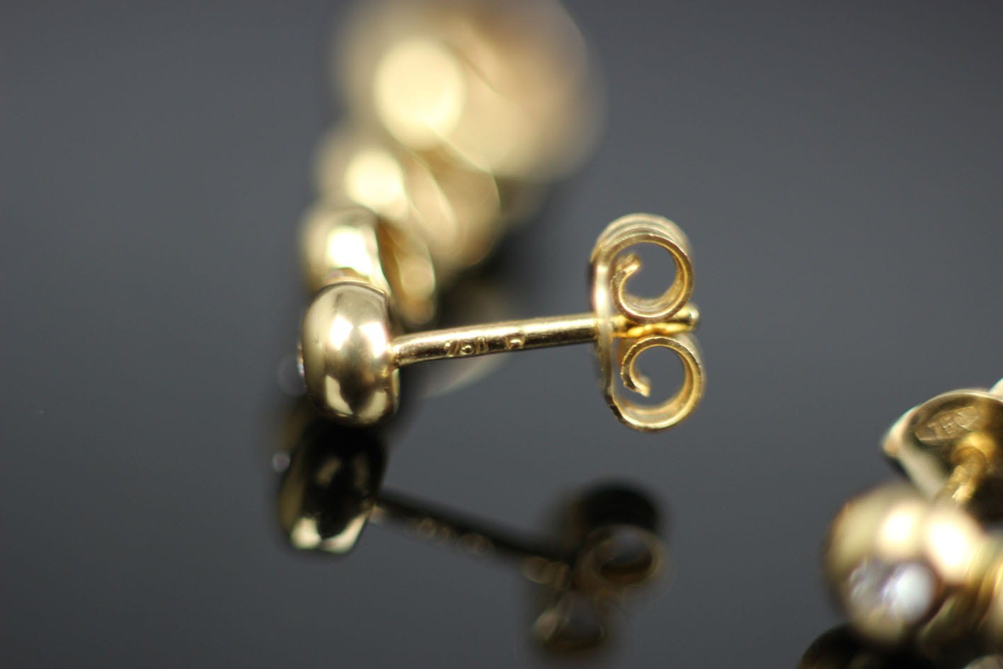 Szykowne kolczyki z lat 70-tych XX wieku, wykonane w 18 karatowym złocie, sygnowane na sztyfcie i barankach puncą 750. Kolczyki kameryzowane ośmioma diamentami w szlifie okrągłym brylantowym. Masa kamieni ok. 0,34 ct, barwa G-F, Czystość VS-SI. Zapięcie typu sztyft. W komplecie certyfikat renomowanego rzeczoznawcy diamentów. Wymiary: