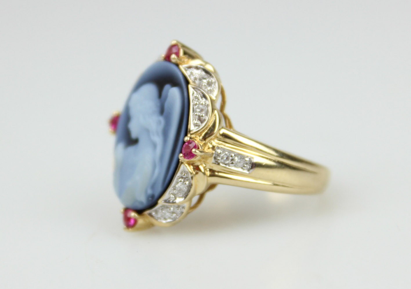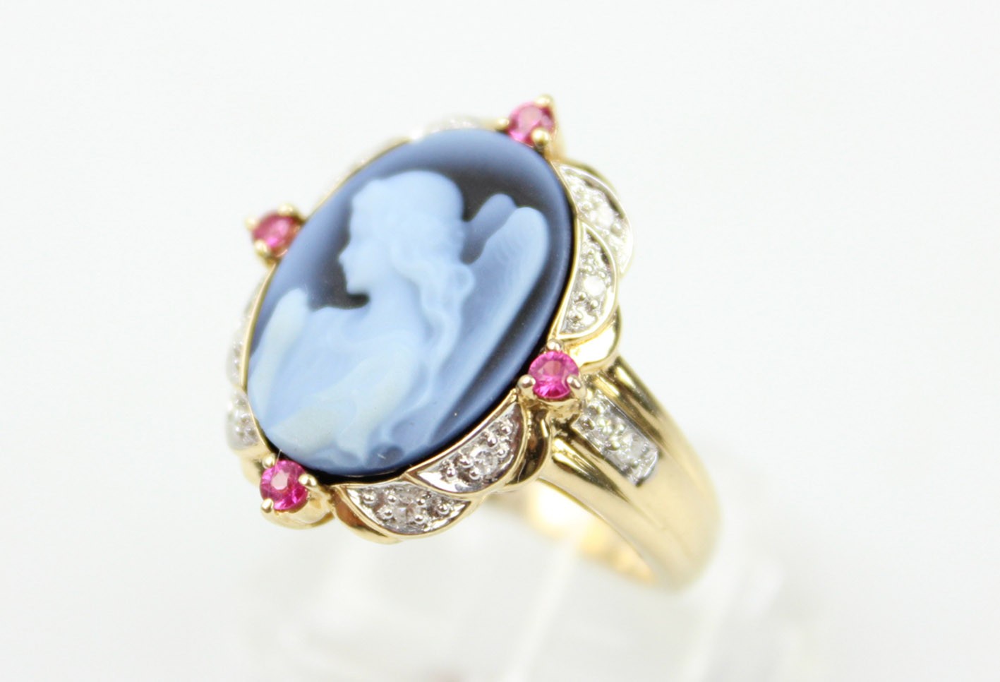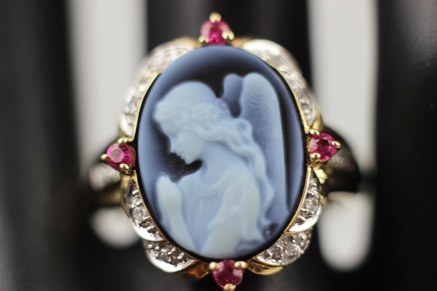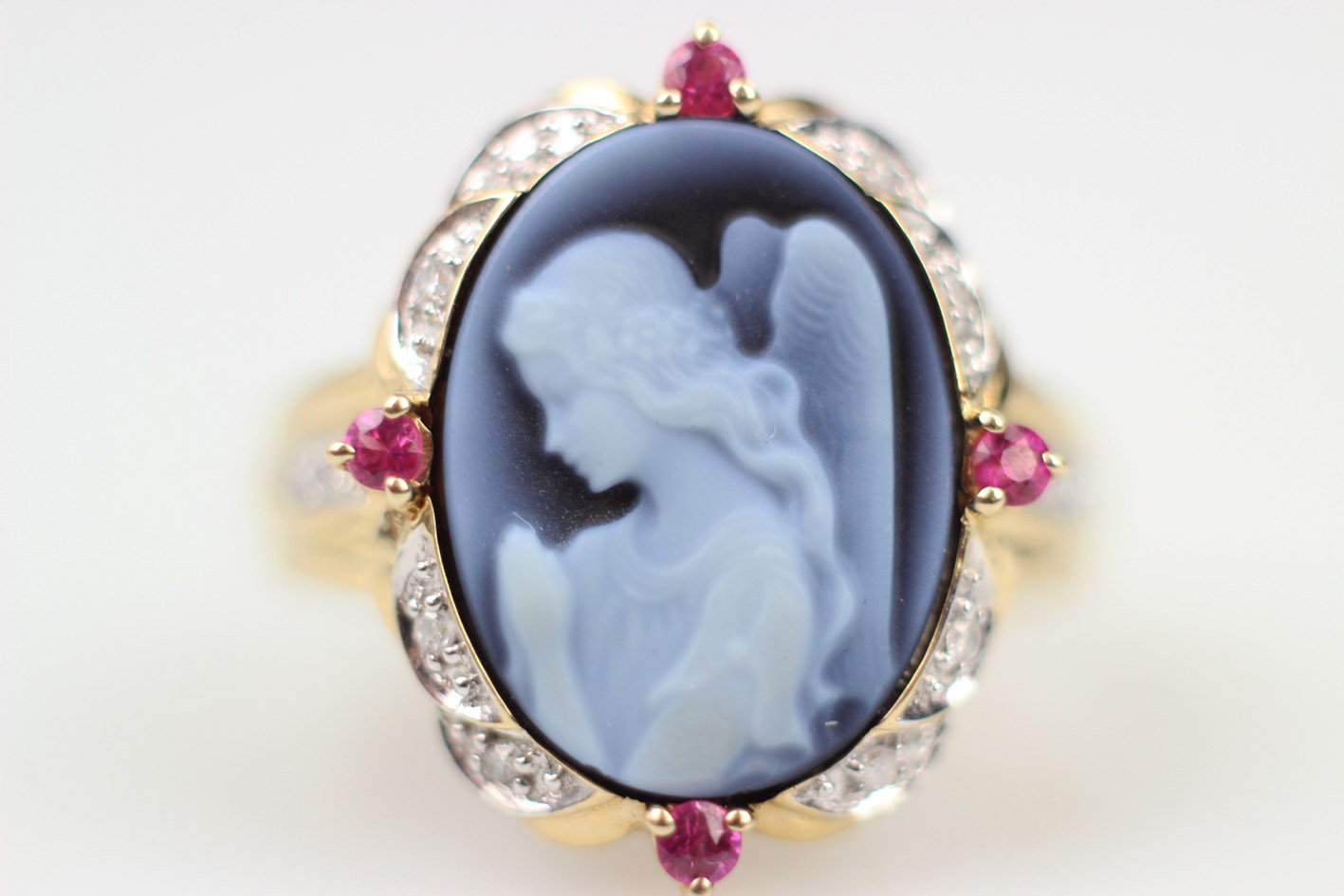 Niepowtarzalny pierścionek z kameą przedstawiający subtelny profil anioła, wyrzeźbiony w czarno-białym onyksie (chalcedonie). Motyw postaci z wyraźnie zaznaczonym skrzydłem i wieńcem na włosach ma symboliczny charakter – odwołuje się do tradycji anioła-opiekuna, co nadaje kompozycji mistycznego i ponadczasowego wyrazu. Kama osadzona w dekoracyjnej oprawie o miękkiej linii, ozdobionej czterema rubinami i rzędami drobnych diamentów, które wspaniale rozświetlają całość. Egzemplarz wykonany w złocie próby 585 ( 14k). Centralnie umieszczona kamea w onyksie ma wymiary 12,10 × 15,90 × 3,55 mm. Towarzyszą jej cztery naturalne rubiny o łącznej masie ok. 0,09 ct oraz dwanaście diamentów o szlifie 8/8 i łącznej masie ok. 0,10 ct. Stan zachowania bardzo dobry.