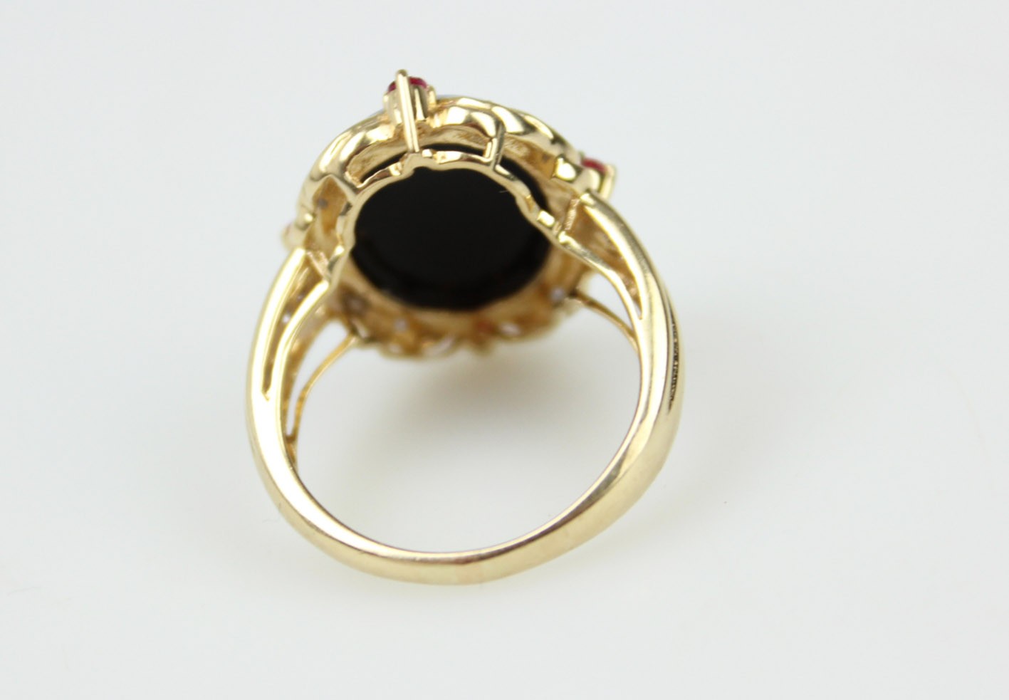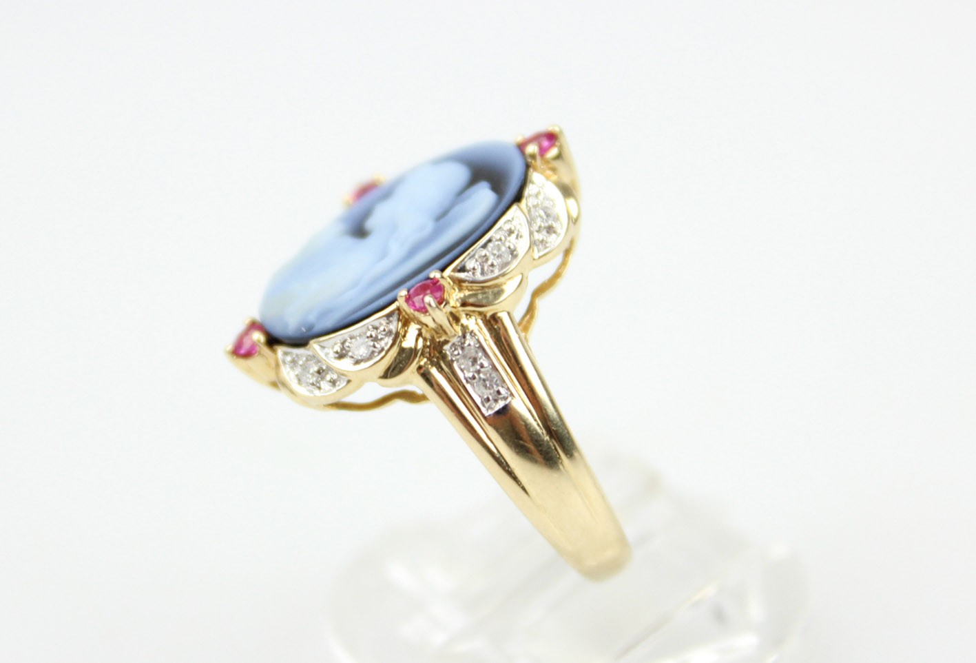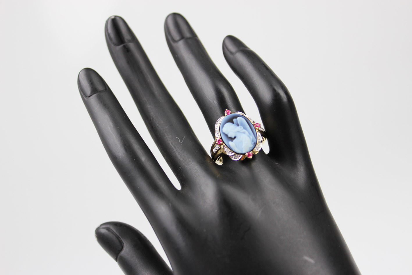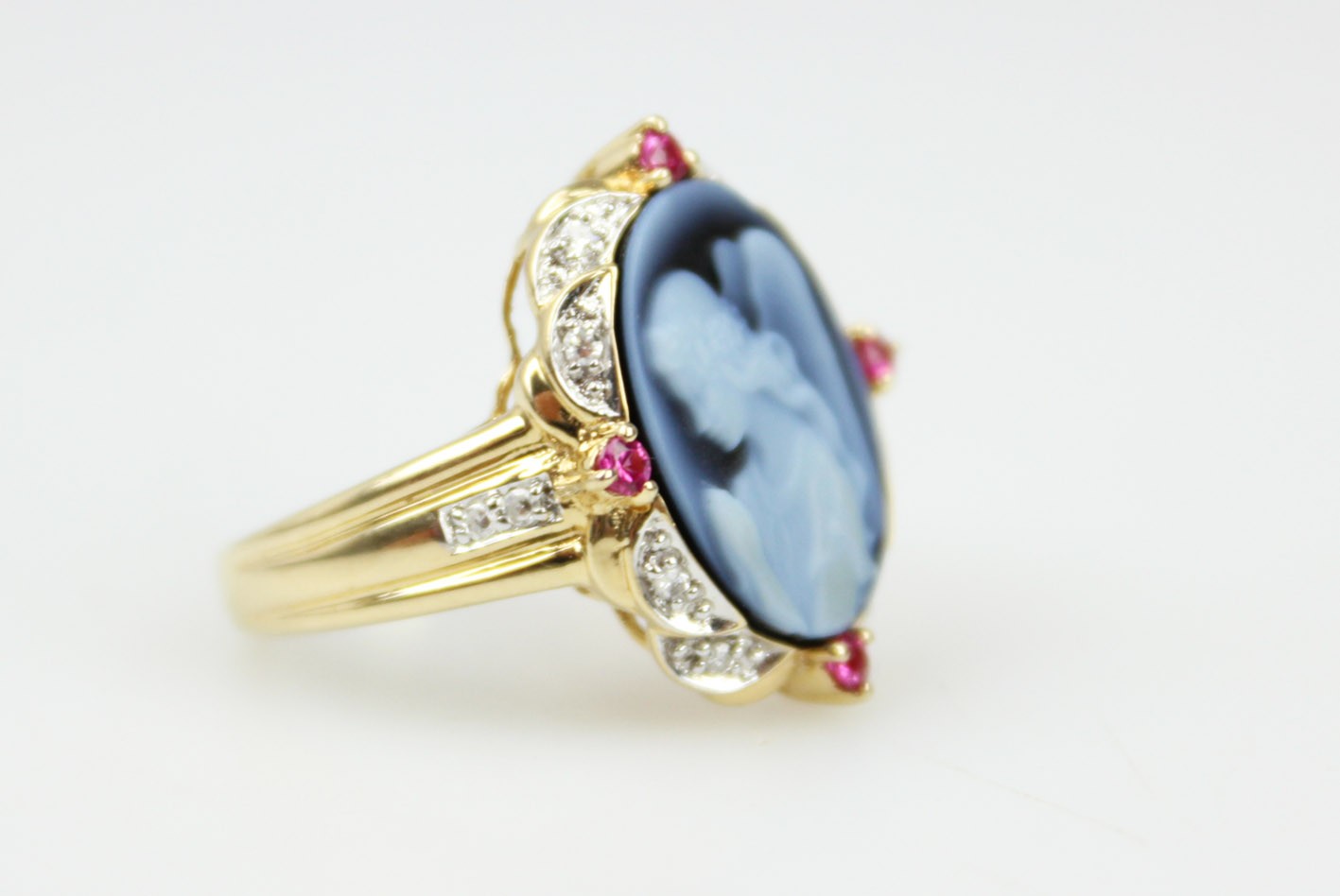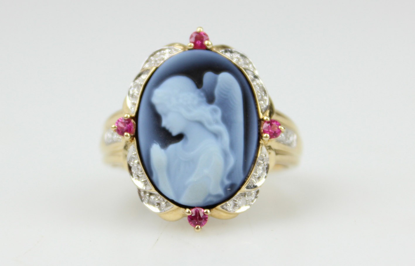 Niepowtarzalny pierścionek z kameą przedstawiający subtelny profil anioła, wyrzeźbiony w czarno-białym onyksie (chalcedonie). Motyw postaci z wyraźnie zaznaczonym skrzydłem i wieńcem na włosach ma symboliczny charakter – odwołuje się do tradycji anioła-opiekuna, co nadaje kompozycji mistycznego i ponadczasowego wyrazu. Kama osadzona w dekoracyjnej oprawie o miękkiej linii, ozdobionej czterema rubinami i rzędami drobnych diamentów, które wspaniale rozświetlają całość. Egzemplarz wykonany w złocie próby 585 ( 14k). Centralnie umieszczona kamea w onyksie ma wymiary 12,10 × 15,90 × 3,55 mm. Towarzyszą jej cztery naturalne rubiny o łącznej masie ok. 0,09 ct oraz dwanaście diamentów o szlifie 8/8 i łącznej masie ok. 0,10 ct. Stan zachowania bardzo dobry.