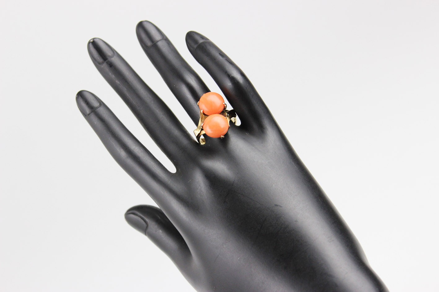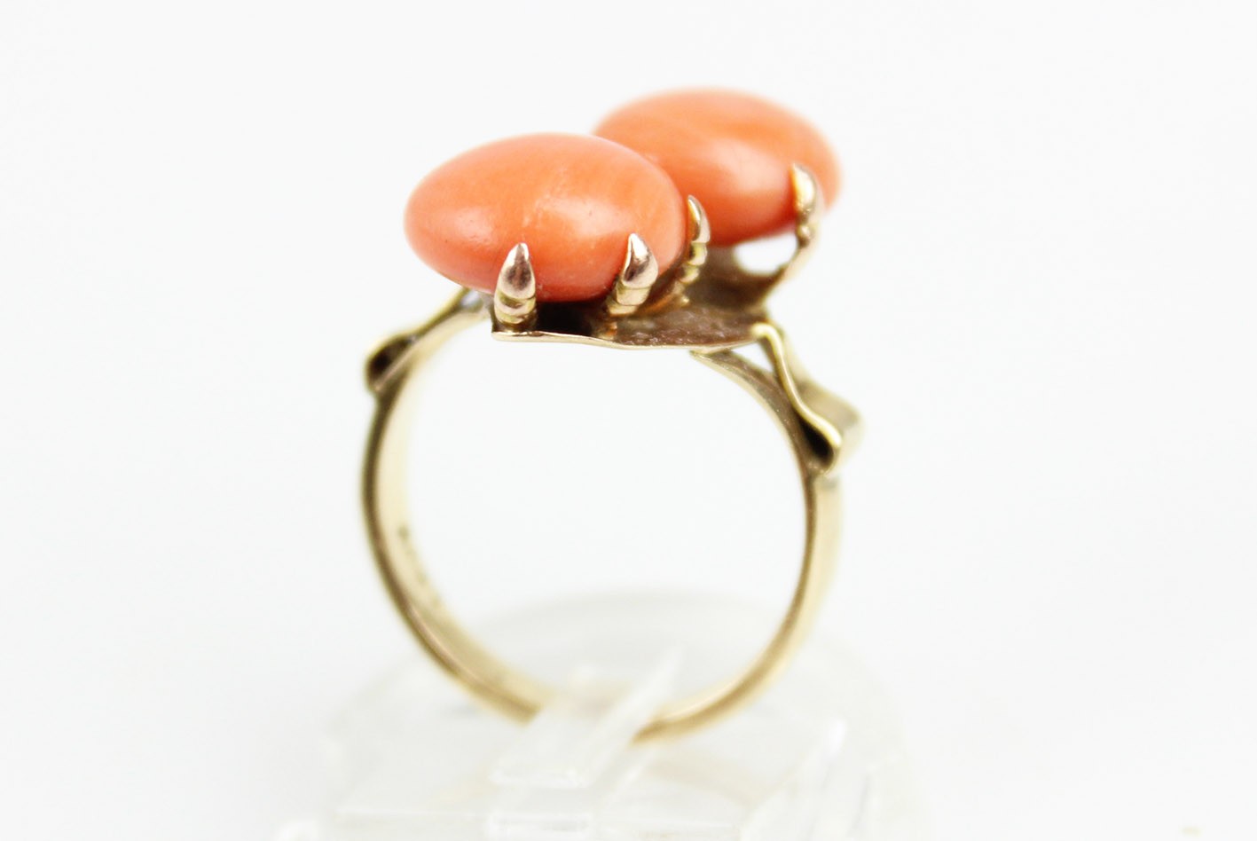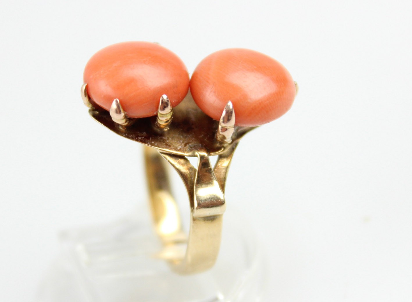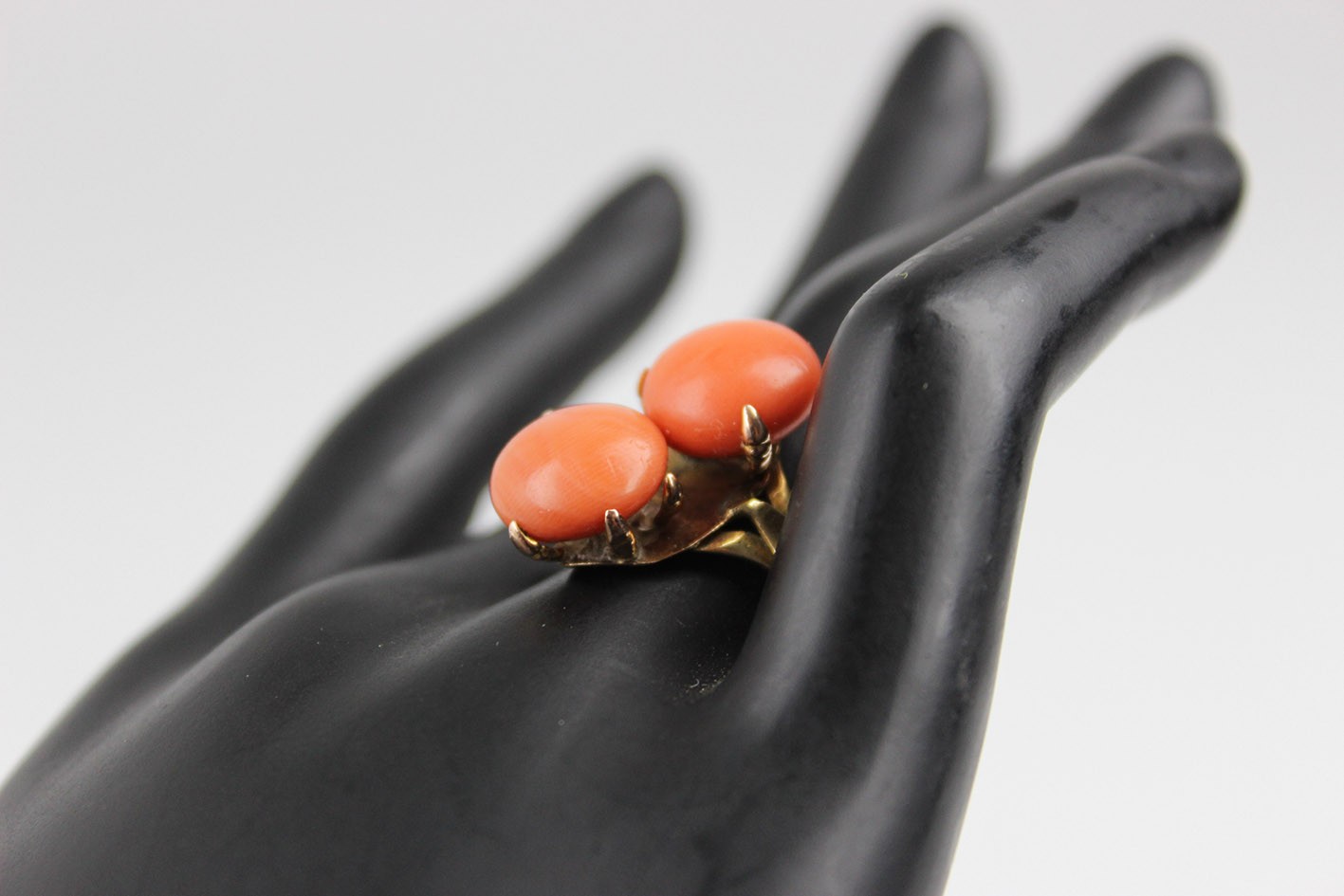 Elegancki, stylowy pierścionek wykonany ze złota próby 585, ozdobiony dwoma okazałymi, naturalnymi kaboszonami z korala szlachetnego w intensywnym, ciepłym odcieniu pomarańczowym. Kamienie zostały oprawione w klasyczne czteroramienne łapki, co podkreśla ich organiczne piękno i subtelny połysk. Szyna pierścionka o mocnym profilu stanowiąca eleganckie podparcie pod ażurową, asymetryczną oprawę, typową dla wzornictwa z połowy XX wieku. Całość zachowana w bardzo dobrym stanie kolekcjonerskim — bez uszkodzeń kamieni z lekkimi, naturalnymi śladami użytkowania na złocie. Wymiary:
