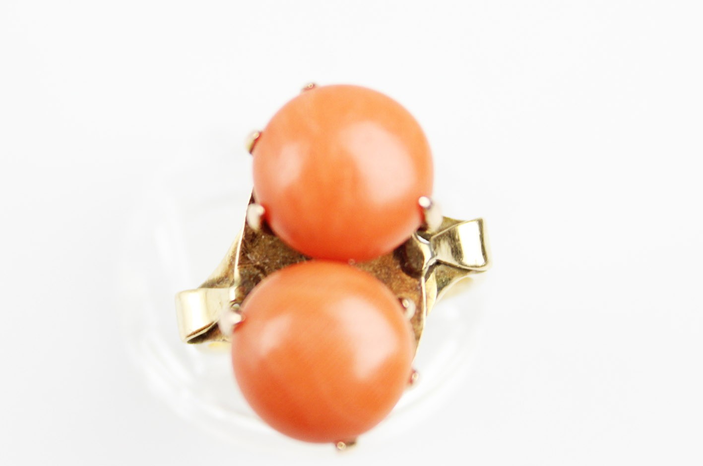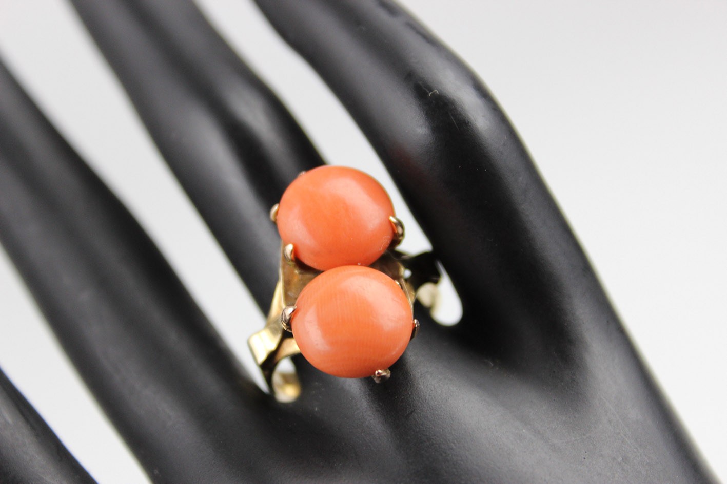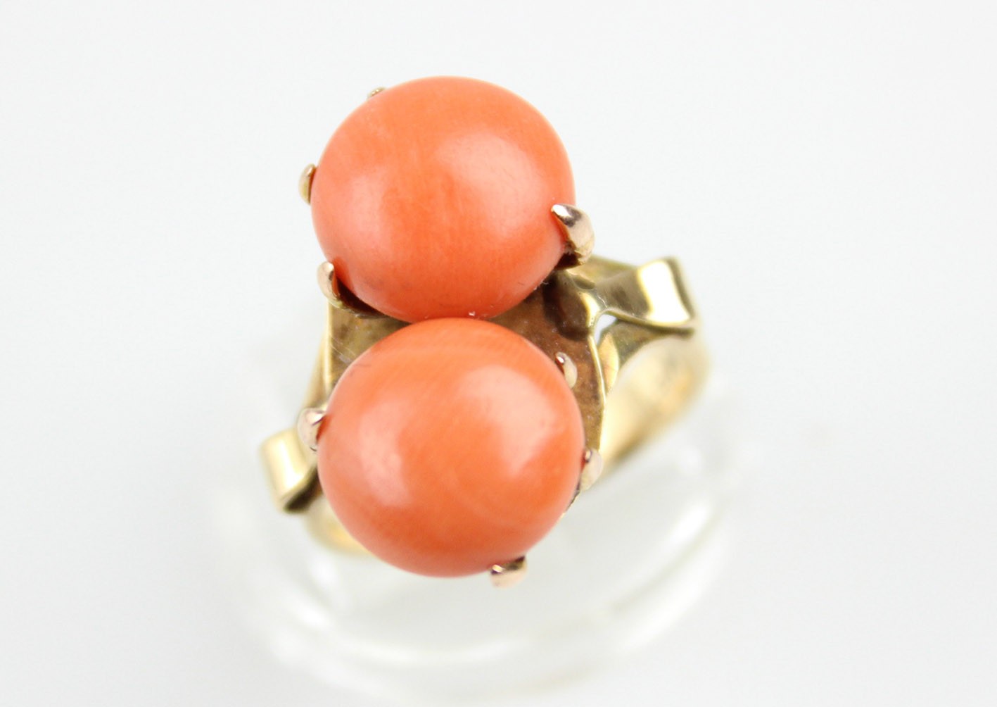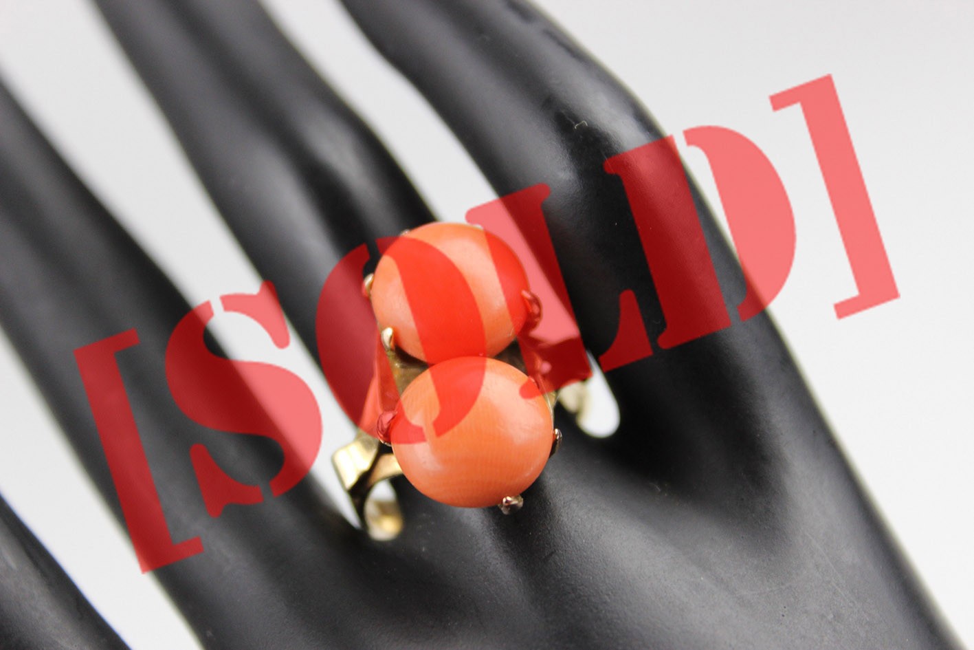 Elegancki, stylowy pierścionek wykonany ze złota próby 585, ozdobiony dwoma okazałymi, naturalnymi kaboszonami z korala szlachetnego w intensywnym, ciepłym odcieniu pomarańczowym. Kamienie zostały oprawione w klasyczne czteroramienne łapki, co podkreśla ich organiczne piękno i subtelny połysk. Szyna pierścionka o mocnym profilu stanowiąca eleganckie podparcie pod ażurową, asymetryczną oprawę, typową dla wzornictwa z połowy XX wieku. Całość zachowana w bardzo dobrym stanie kolekcjonerskim — bez uszkodzeń kamieni z lekkimi, naturalnymi śladami użytkowania na złocie. Wymiary: