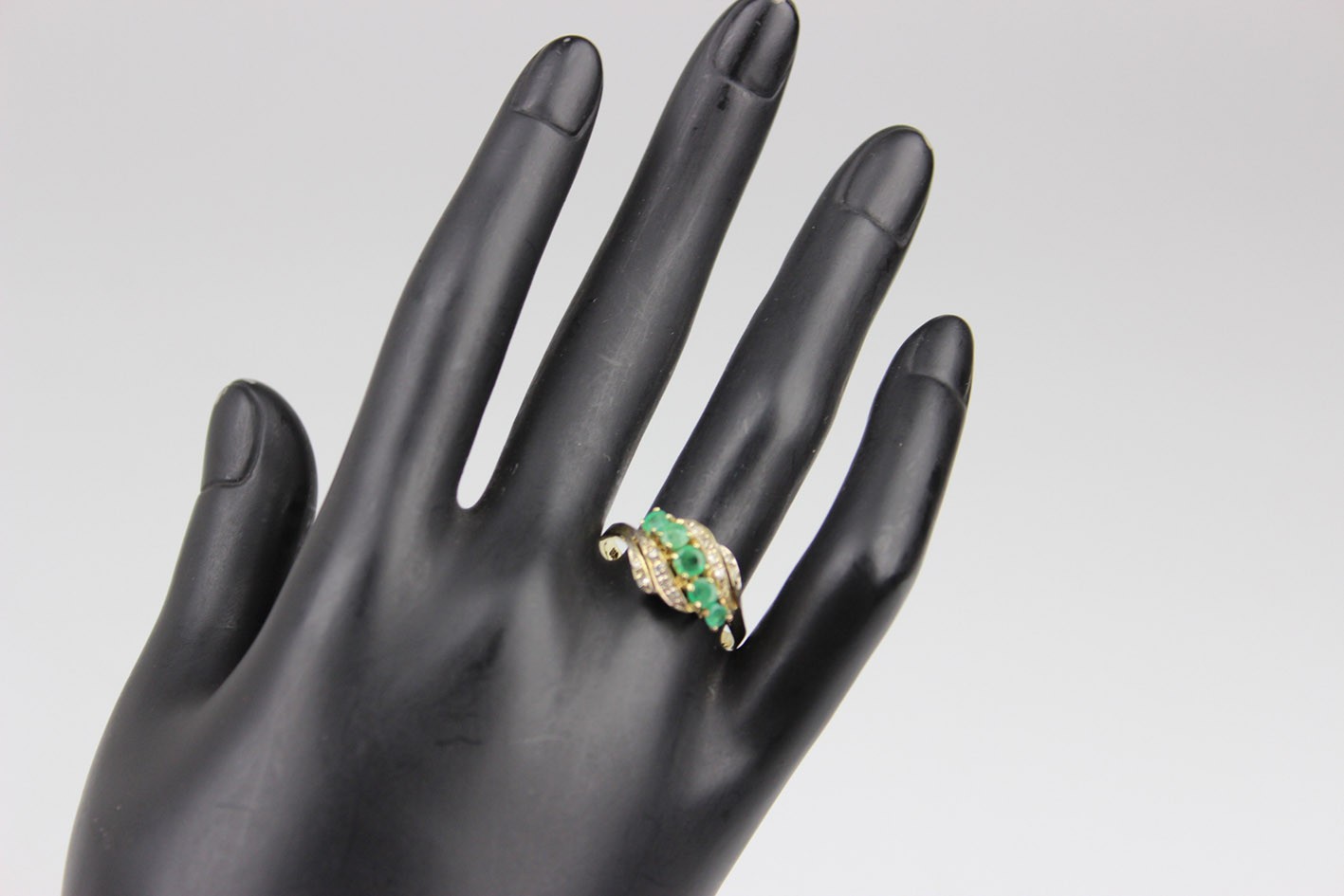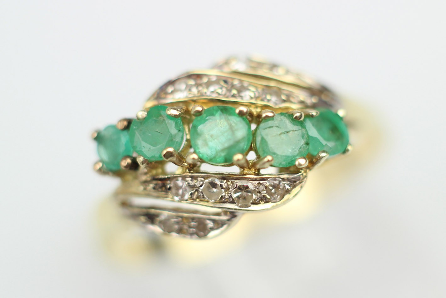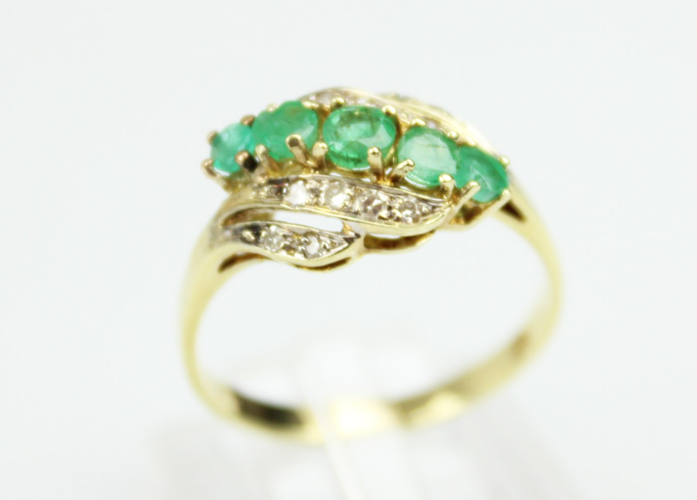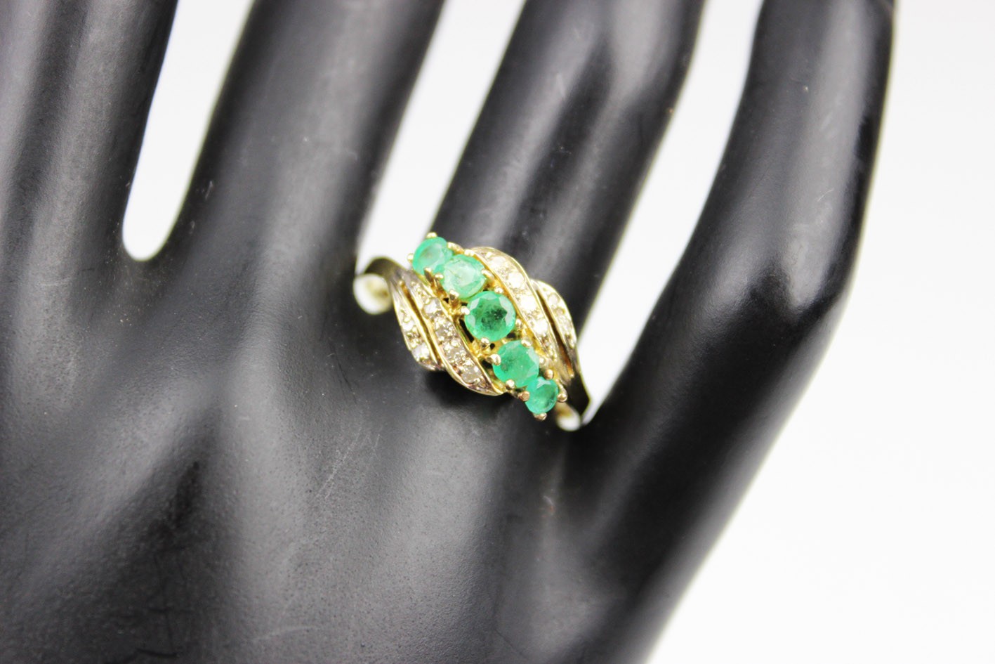 Pierścionek z przełomu lat 70-tych i 80-tych XX wieku, w eleganckim układzie, gdzie falujące wstęgi oplatają pięć soczyście zielonych szmaragdów o szlifie fasetowym (średnica ok. 2,70–3,50 mm, wysokość 1,80–2,30 mm; łączna masa obliczeniowa ok. 0,55 ct), między którymi migocze dwanaście diamentów starych szlifów 8/8 o średnicy 1,25–1,50 mm (łącznie ok. 0,15 ct). Kompozycja daje wrażenie ruchu i lekkości, a naturalne inkluzje szmaragdów pięknie grają z dyskretnym, „gwiazdkowym” blaskiem diamentów. Całość osadzona jest w żółtym złocie próby 0,585 z czytelną puncą 585 na szynie. Pierścionek w bardzo dobrym stanie zachowania. Klasyk estetyki retro-modern: wygodny do codziennego noszenia, a jednocześnie na tyle efektowny, by pełnić rolę pierścionka koktajlowego. W komplecie certyfikat renomowanego rzeczoznawcy gemmologa. Wymiary: