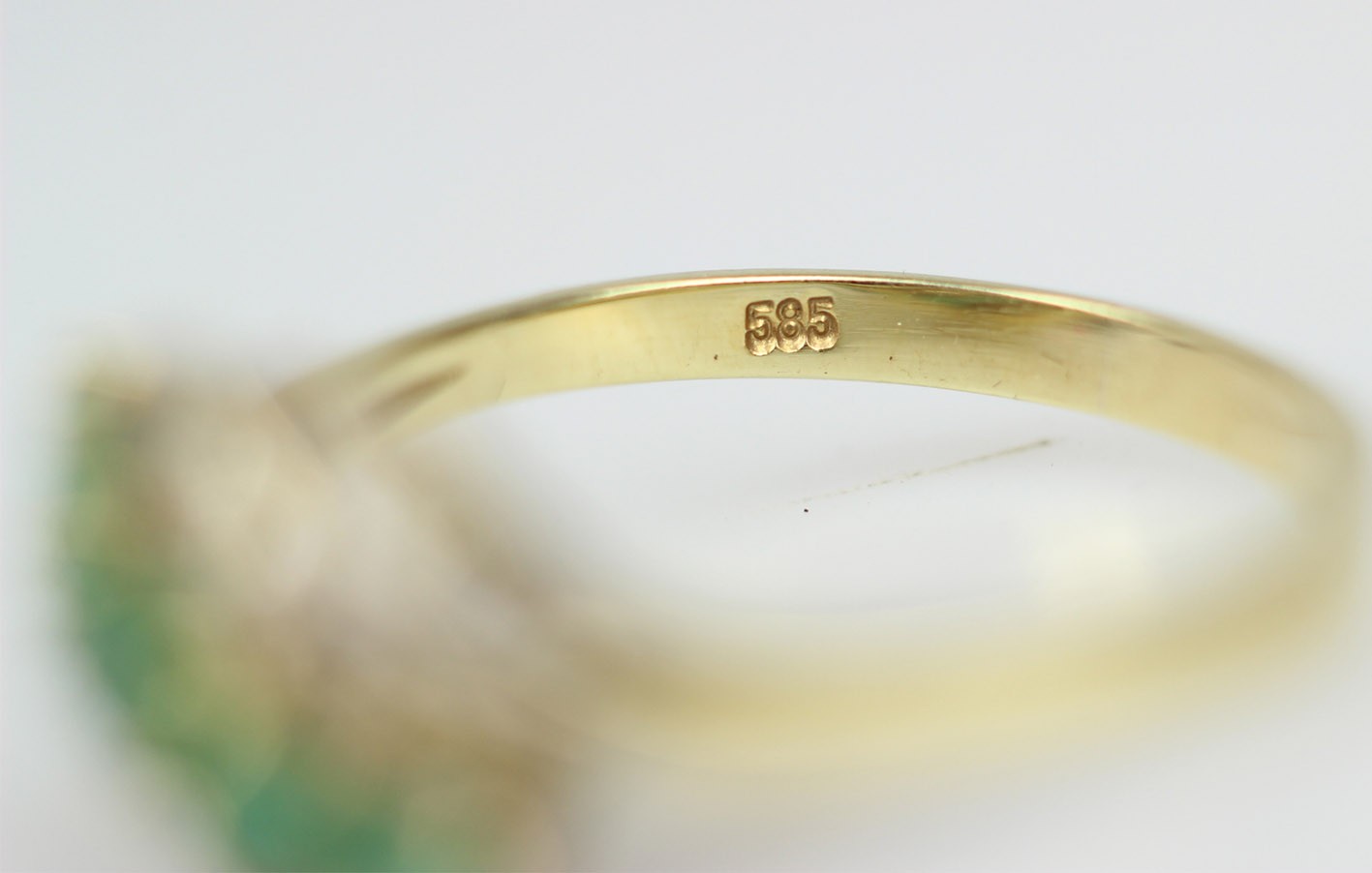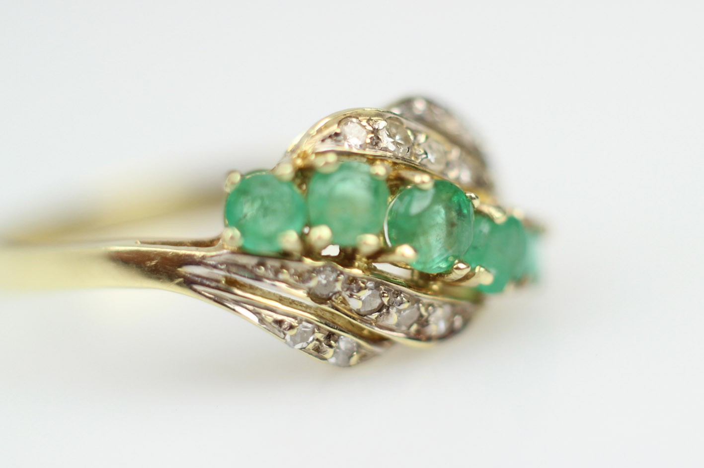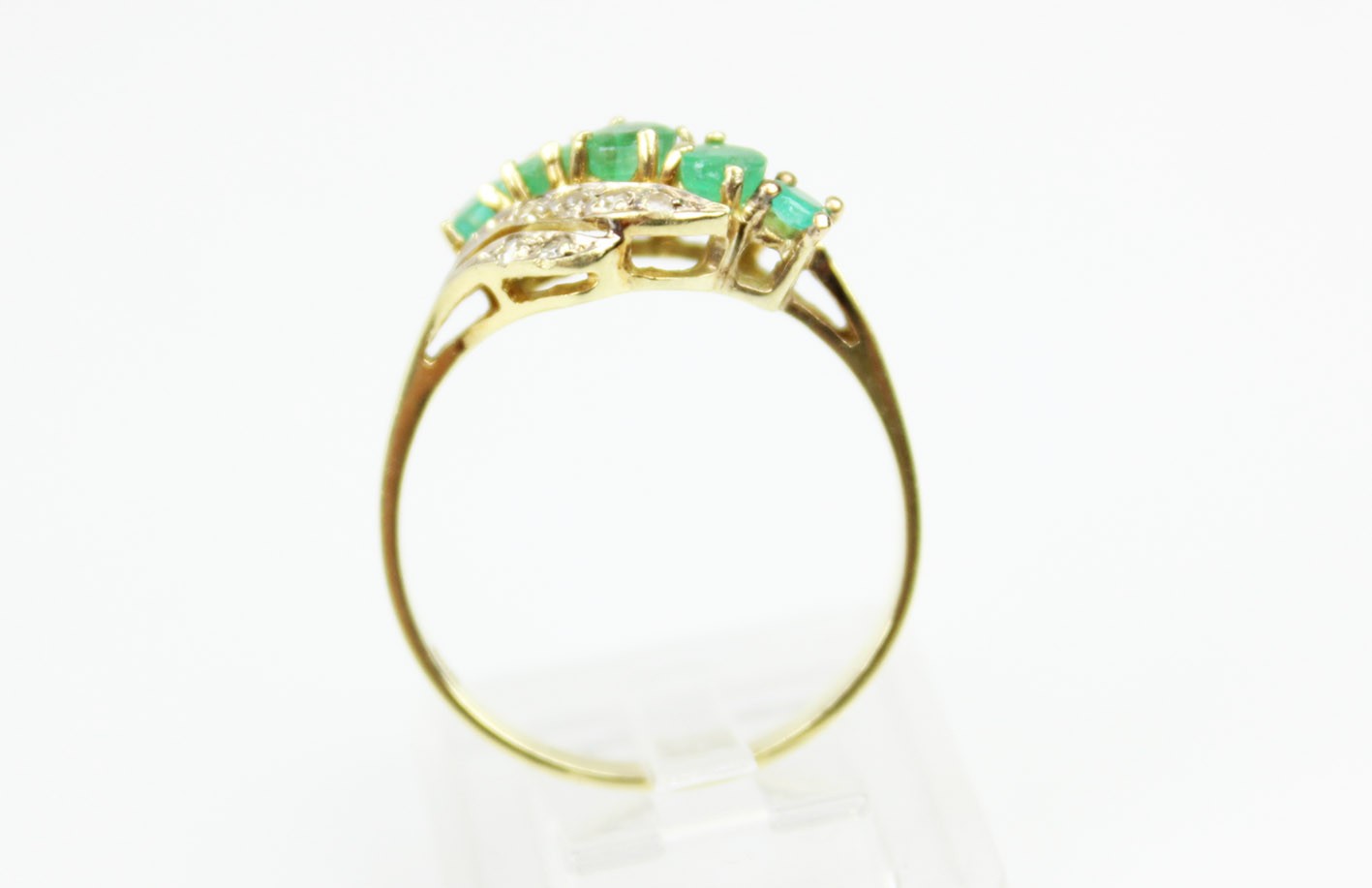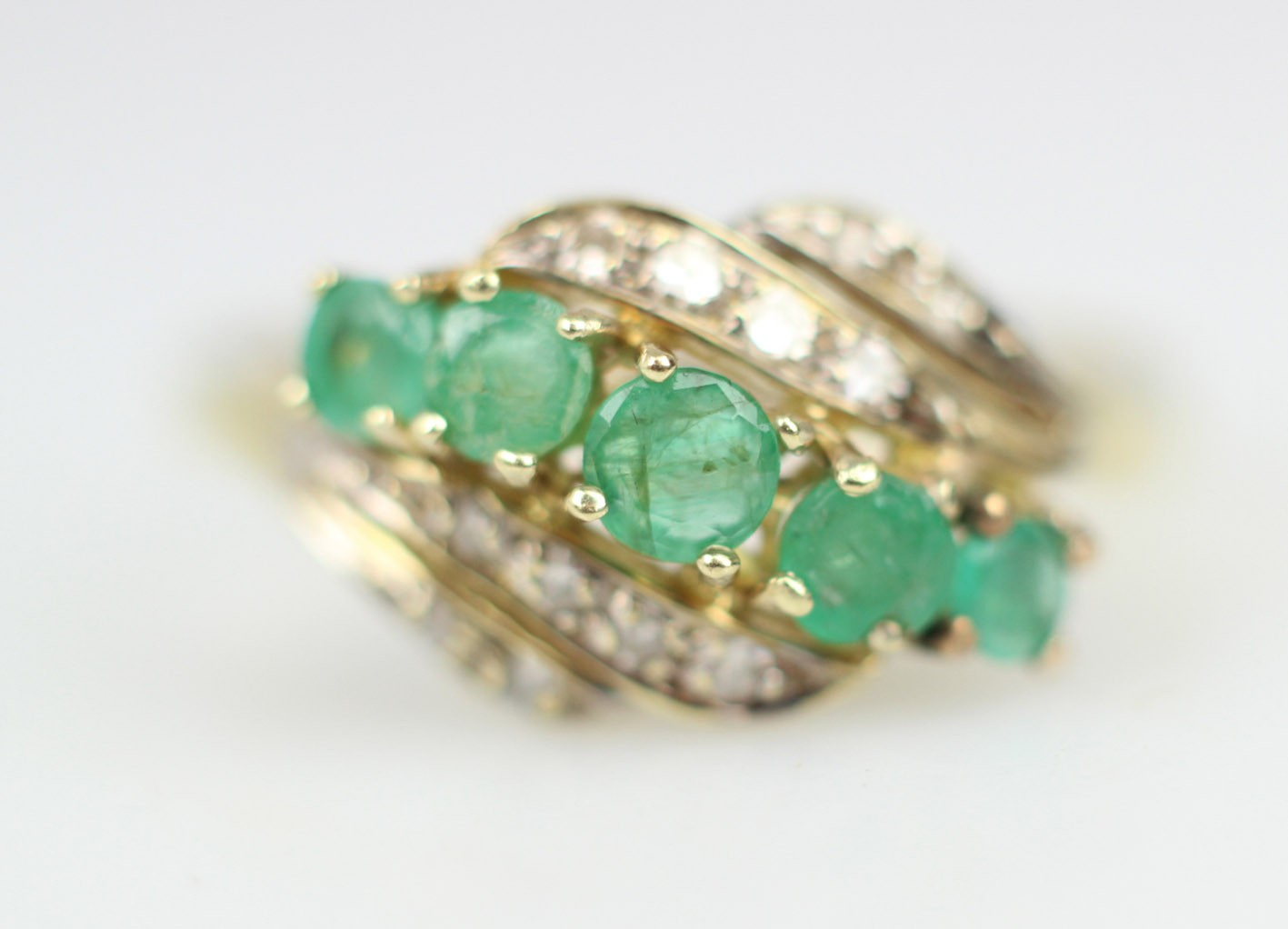 Pierścionek z przełomu lat 70-tych i 80-tych XX wieku, w eleganckim układzie, gdzie falujące wstęgi oplatają pięć soczyście zielonych szmaragdów o szlifie fasetowym (średnica ok. 2,70–3,50 mm, wysokość 1,80–2,30 mm; łączna masa obliczeniowa ok. 0,55 ct), między którymi migocze dwanaście diamentów starych szlifów 8/8 o średnicy 1,25–1,50 mm (łącznie ok. 0,15 ct). Kompozycja daje wrażenie ruchu i lekkości, a naturalne inkluzje szmaragdów pięknie grają z dyskretnym, „gwiazdkowym” blaskiem diamentów. Całość osadzona jest w żółtym złocie próby 0,585 z czytelną puncą 585 na szynie. Pierścionek w bardzo dobrym stanie zachowania. Klasyk estetyki retro-modern: wygodny do codziennego noszenia, a jednocześnie na tyle efektowny, by pełnić rolę pierścionka koktajlowego. W komplecie certyfikat renomowanego rzeczoznawcy gemmologa. Wymiary: