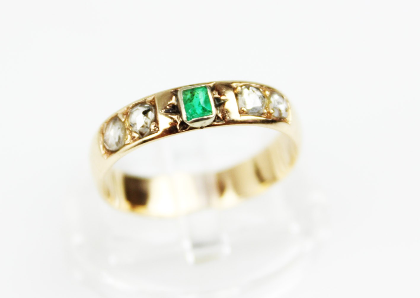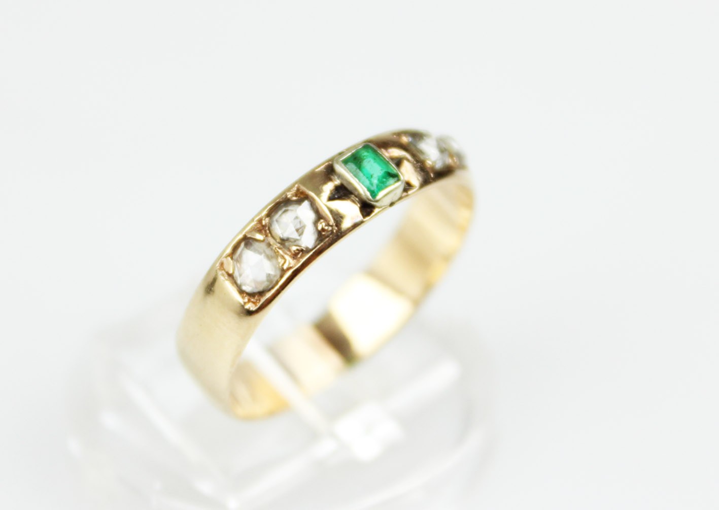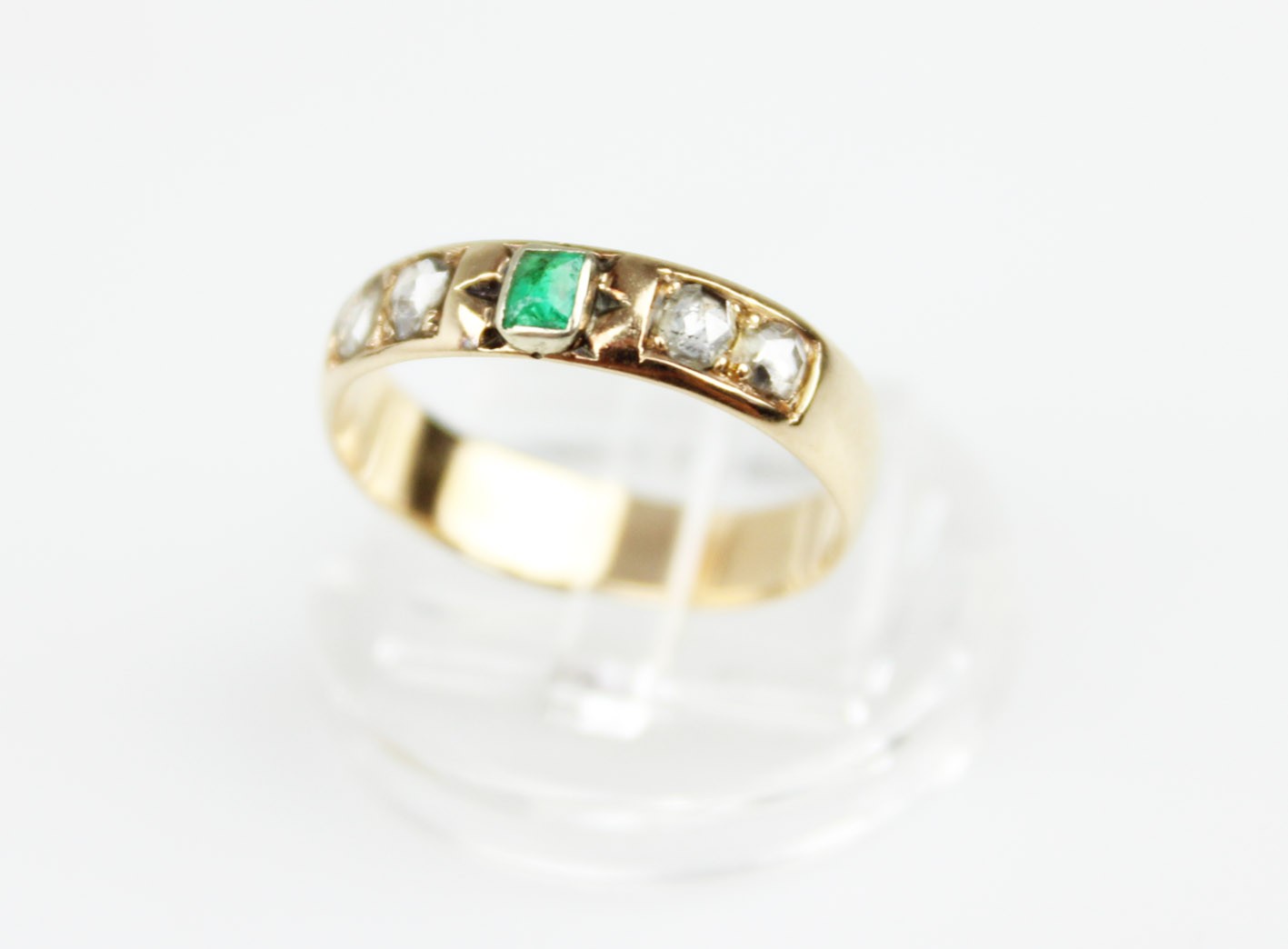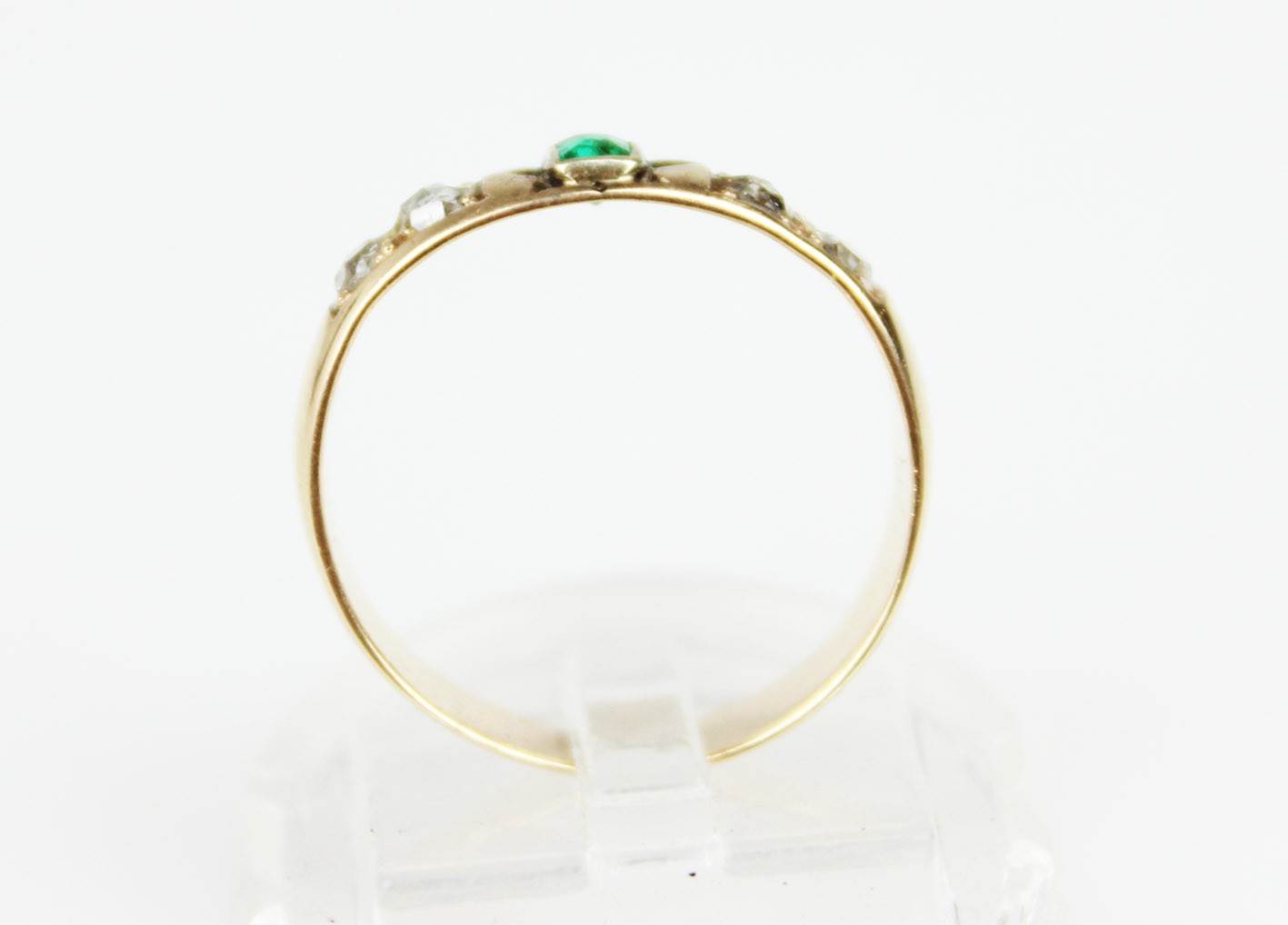 Elegancki przykład wczesno XX-wiecznego jubilerstwa europejskiego, łączącego klasyczną oprawę z piękną harmonią barwy i blasku kamieni. Pierścionek wykonany ze złota żółtego próby 0,585, o masie 2,53 g. Centralnie oprawiono naturalny szmaragd o barwie intensywnej zieleni, szlifie prostokątnym schodkowym (ok. 2,50 × 3,00 × 2,46 mm), o masie szacunkowej ok. 0,11 ct. Kamień otaczają cztery diamenty w formie okrągłych rozet, każdy o średnicy ok. 2,50–3,00 × 1,10–1,20 mm i łącznej masie ok. 0,25 ct. Układ kamieni, z centralnie umieszczonym szmaragdem i symetrycznie rozmieszczonymi diamentami, podkreśla klasyczną estetykę jubilerską. Całość zachowana w bardzo dobrym stanie z piękną delikatnie spatynowaną powierzchnią złota. Wymiary: