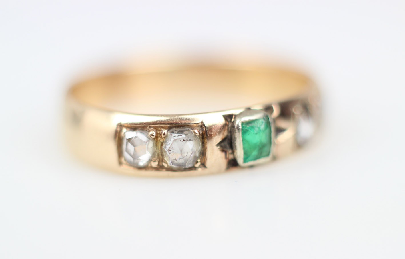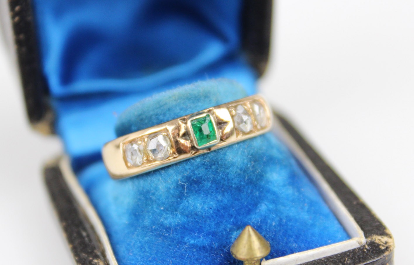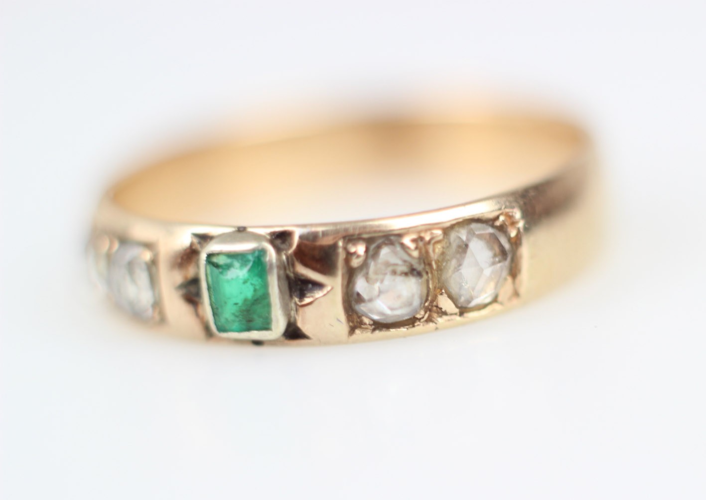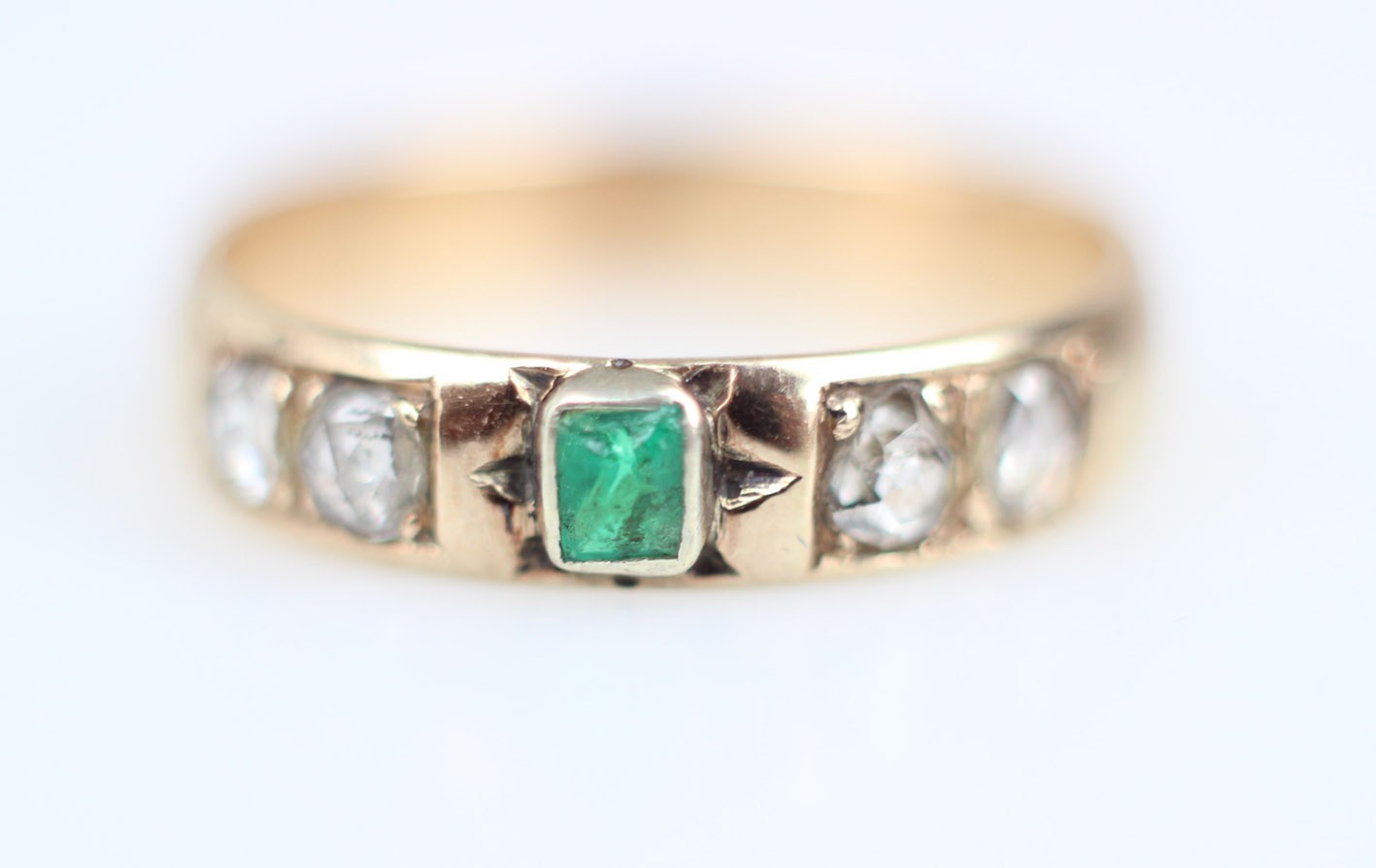 Elegancki przykład wczesno XX-wiecznego jubilerstwa europejskiego, łączącego klasyczną oprawę z piękną harmonią barwy i blasku kamieni. Pierścionek wykonany ze złota żółtego próby 0,585, o masie 2,53 g. Centralnie oprawiono naturalny szmaragd o barwie intensywnej zieleni, szlifie prostokątnym schodkowym (ok. 2,50 × 3,00 × 2,46 mm), o masie szacunkowej ok. 0,11 ct. Kamień otaczają cztery diamenty w formie okrągłych rozet, każdy o średnicy ok. 2,50–3,00 × 1,10–1,20 mm i łącznej masie ok. 0,25 ct. Układ kamieni, z centralnie umieszczonym szmaragdem i symetrycznie rozmieszczonymi diamentami, podkreśla klasyczną estetykę jubilerską. Całość zachowana w bardzo dobrym stanie z piękną delikatnie spatynowaną powierzchnią złota. Wymiary: